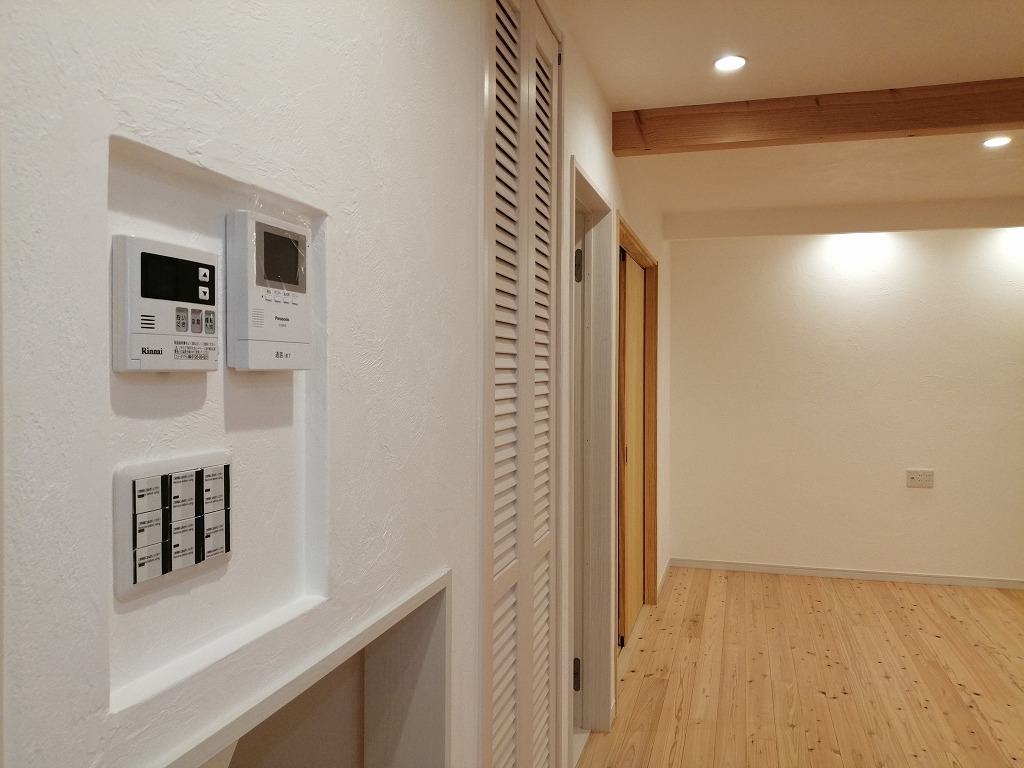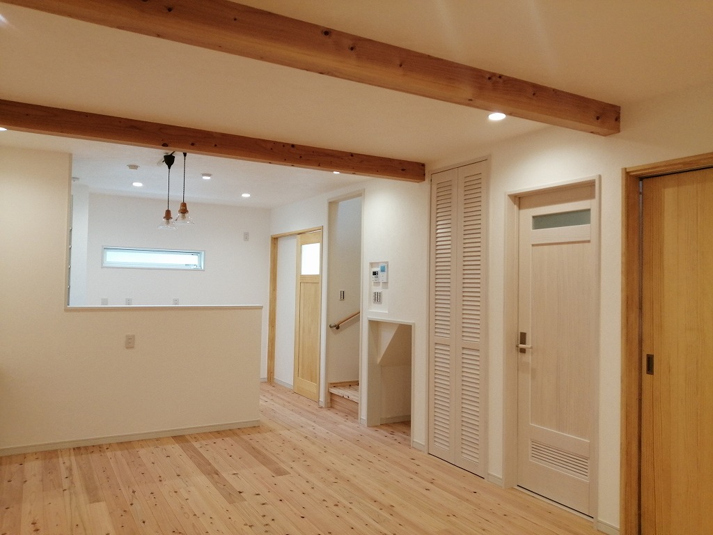 また、岡山県産のまっしろ漆喰塗りのリビングや、無垢パイン材の室内建具など、限られた予算の中で、自然素材を取り入れた木の家です。