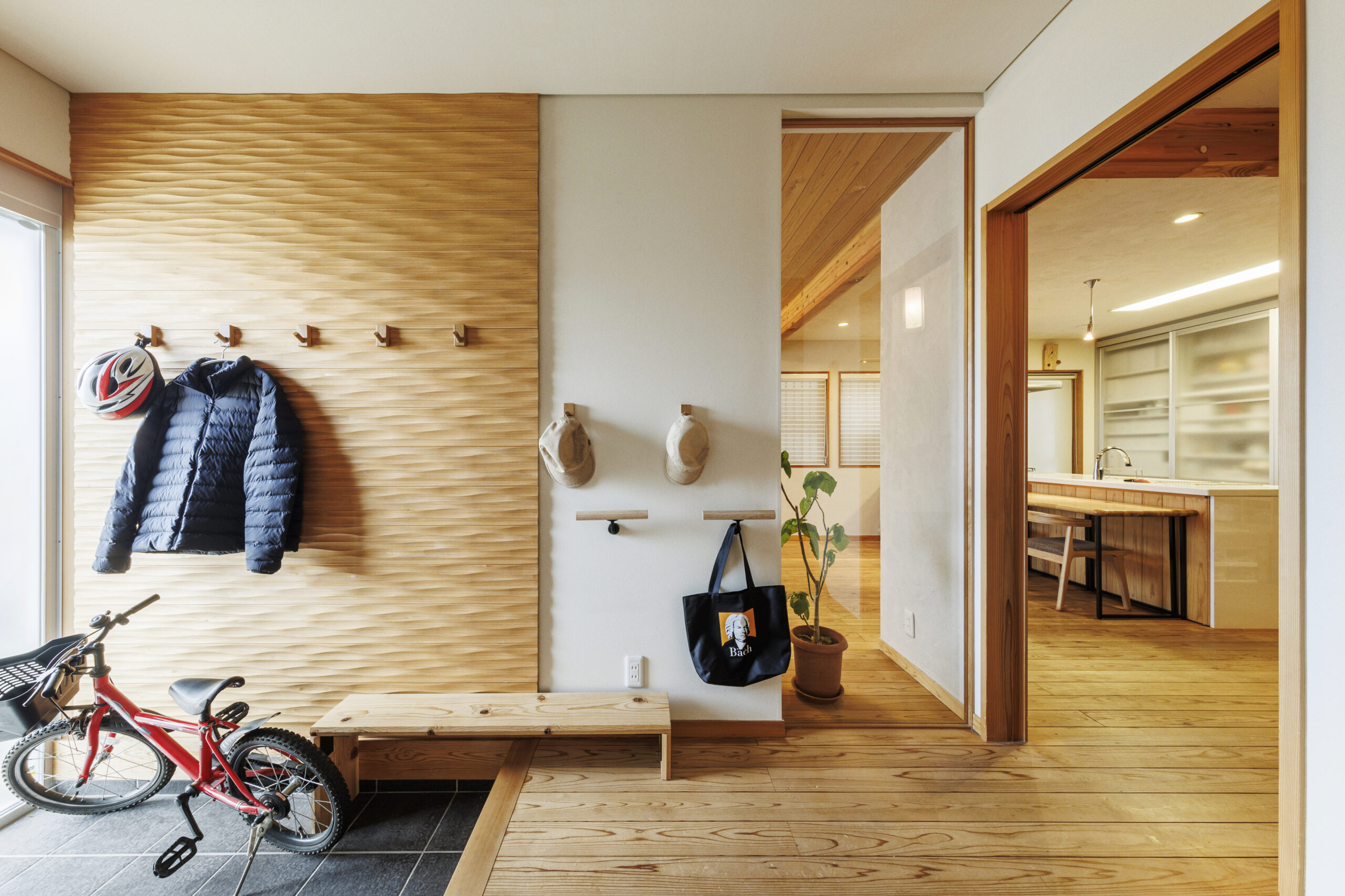 木の壁が印象的な玄関は、毎日のスタートと帰宅を心温まるものにしてくれる場所。子どもたちの元気な表情がよく似合う明るい空間で、成長の瞬間をやさしく受け止めます。収納も整い、使いやすさも十分です。