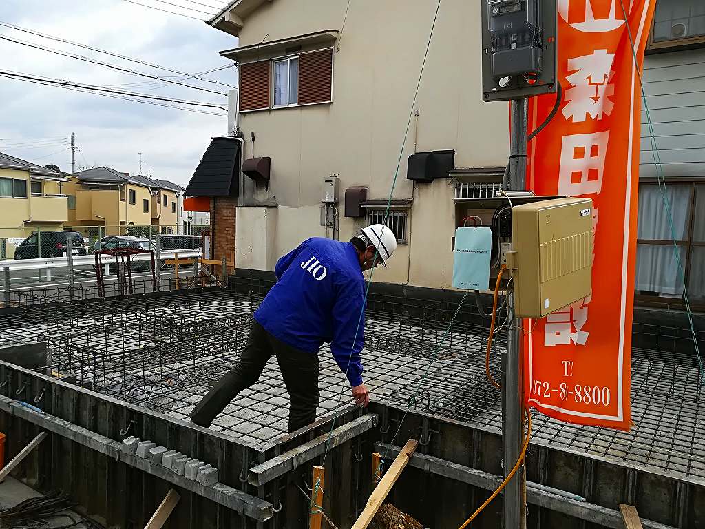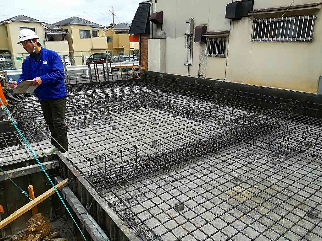 枚方市藤阪元町にて注文住宅の新築一戸建て工事中の現場では、本日朝より検査機関による基礎の配筋検査です。