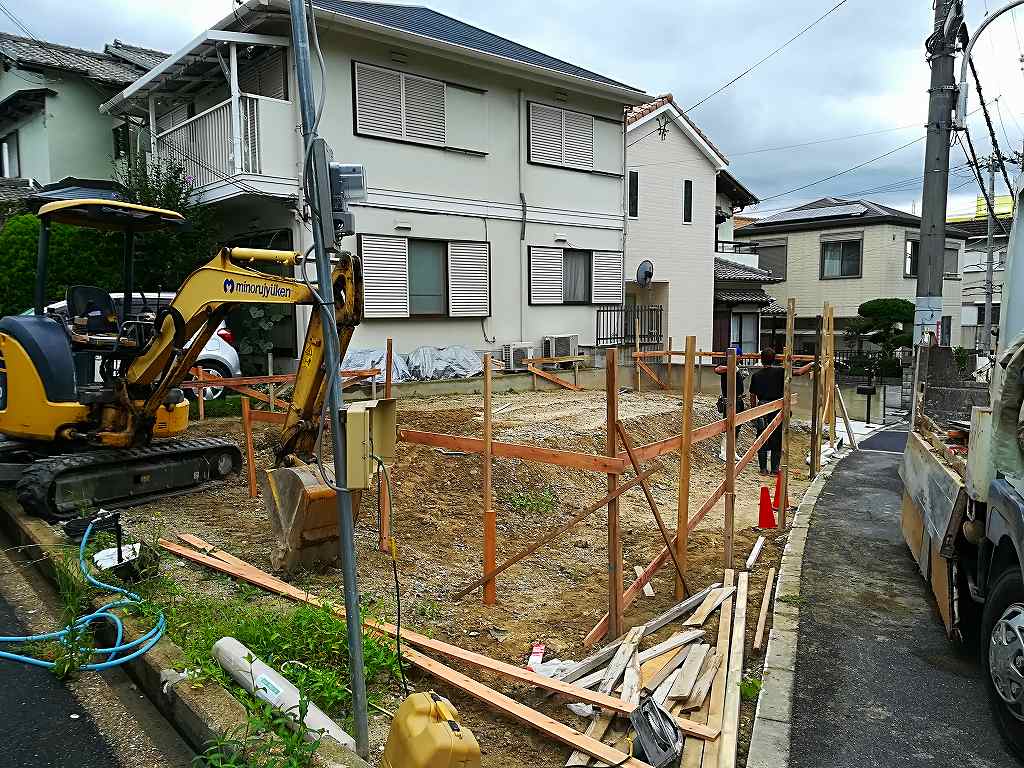 解体工事が終了し、建物本体工事の着工待ちだった枚方市藤阪東町4丁目の家では、本日よりいよいよ基礎工事の着工です。