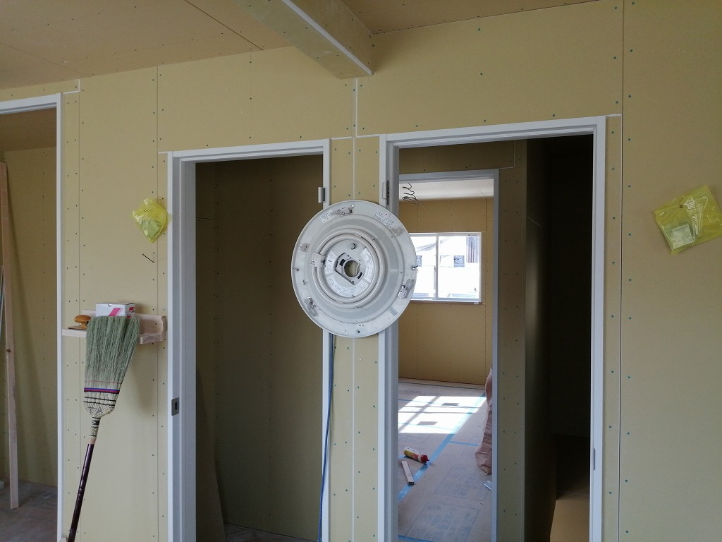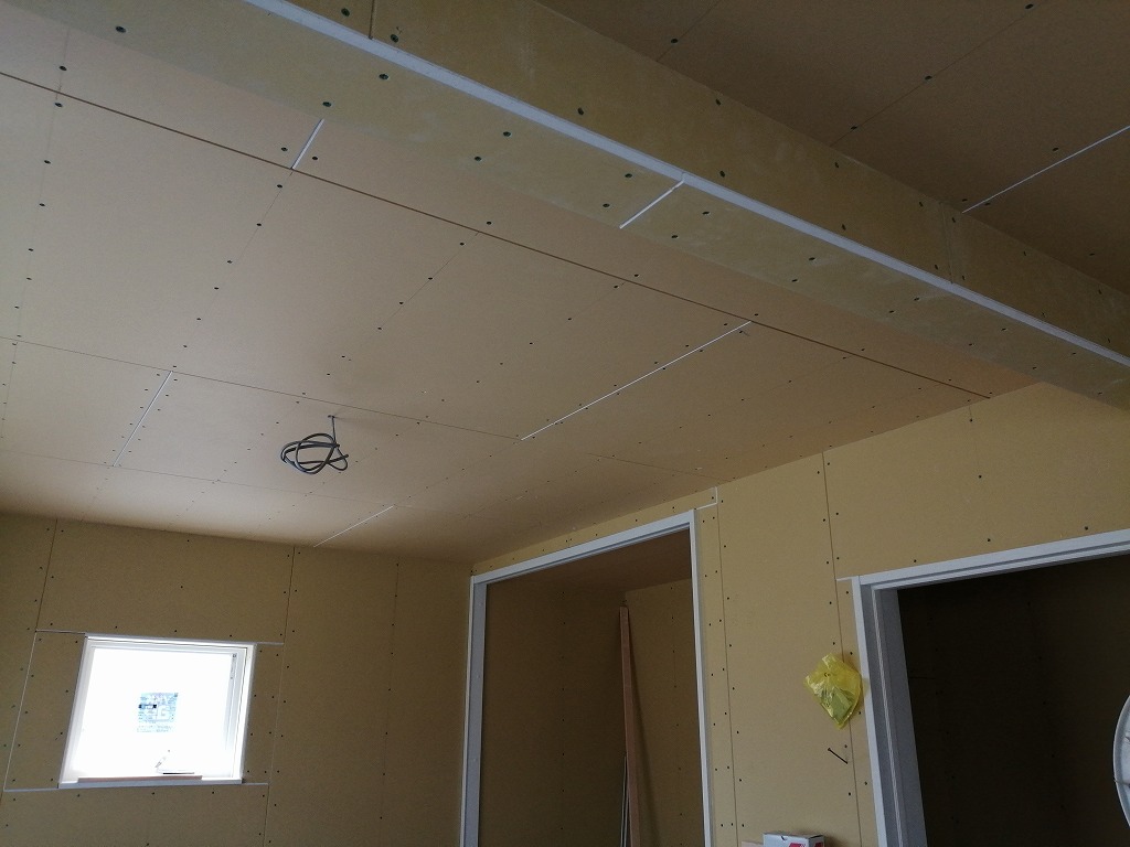 断熱材の施工も終了して、壁や天井の下地材である石膏ボードをどんどん張っていっています。