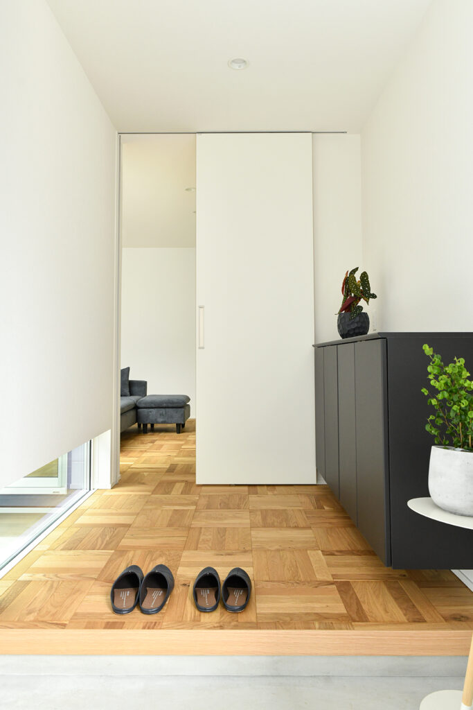 壁を白く、床を自然素材で仕上げることで、家具や観葉植物、照明が際立ち、暮らしの主役が「モノ」ではなく「人」になります。