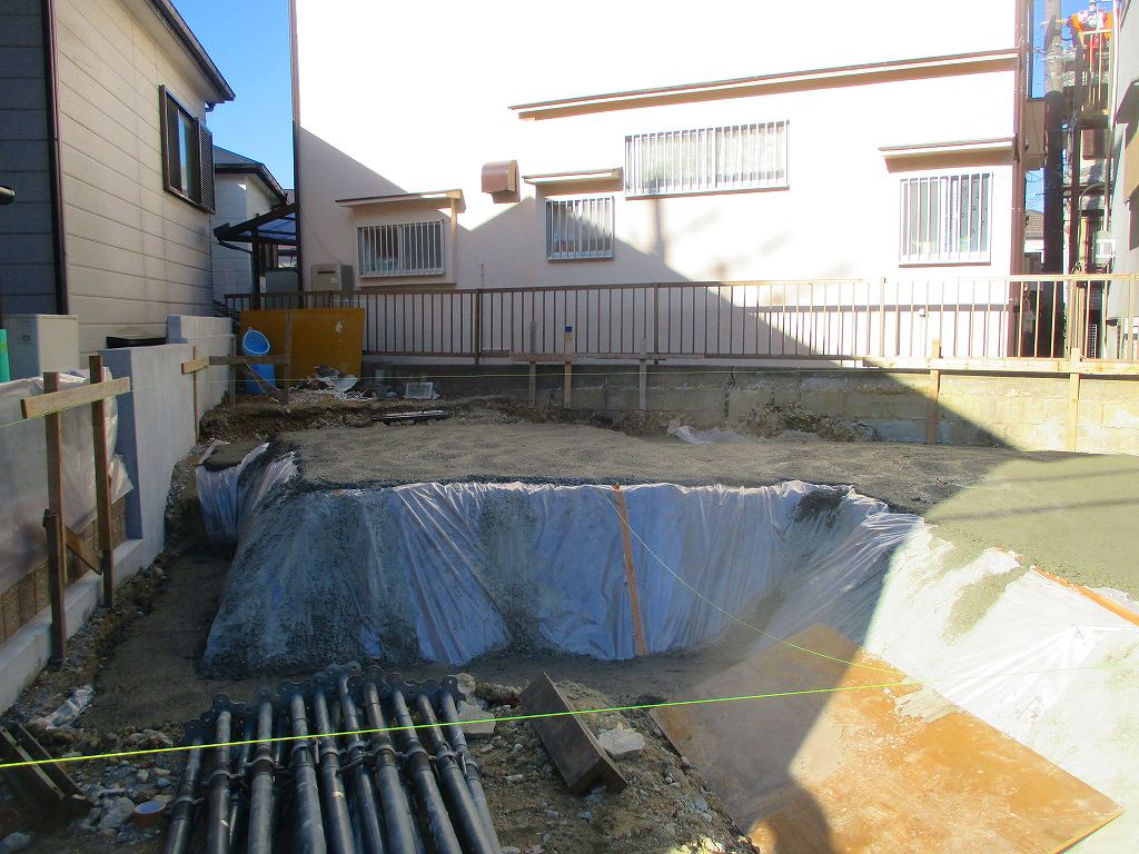 初日は、土を掘削して基礎の形状などをおおよそ出して、その後は防湿フィルムを基礎となる真下一体に敷き込みます。