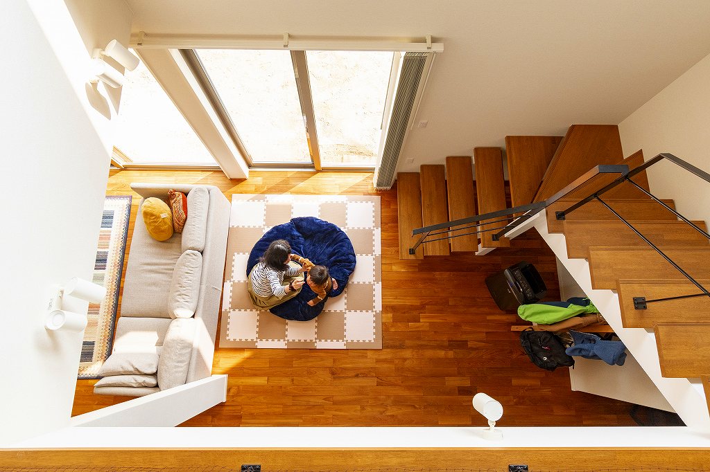 吹抜けスタイルで光を部屋全体に届け、風通しの良い広々とした家を演出。