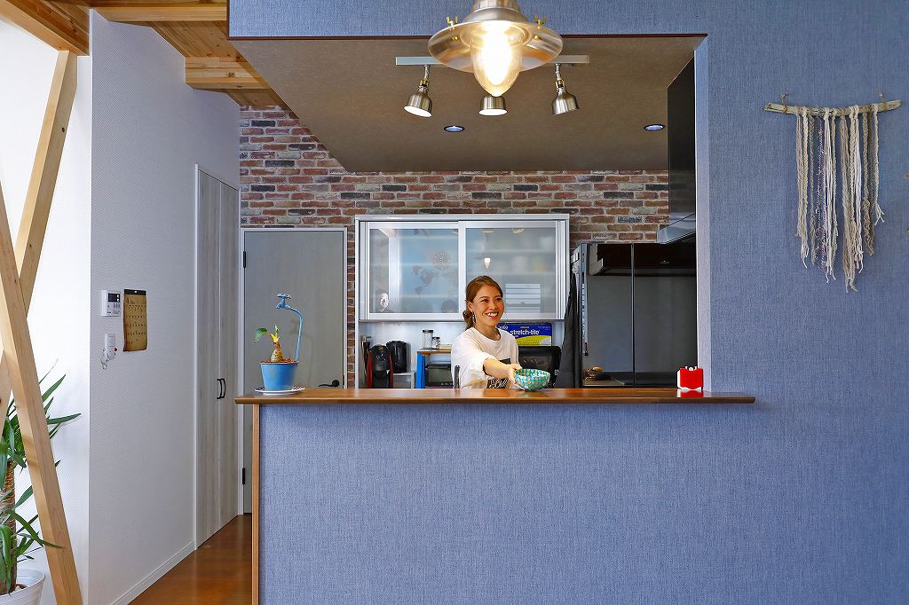 経年変化で風合いが変わるデニムの壁紙やブリックタイル風の壁紙を使い、サーファーズハウスのイメージをベースにデザインしたキッチン。