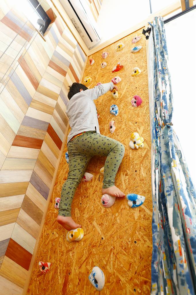 リビングの壁にクライミングウォールを取り付けて子供の遊び場に。