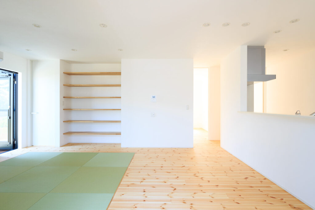 白い壁と無垢床が広がるLDKは、自然光がふんだんに入り、どこにいても明るく心地よい空間。造作棚が生活動線に沿って配置され、見せる収納としても機能。和室とも緩やかにつながり、家族がそれぞれ自由に過ごせる間取りが魅力。